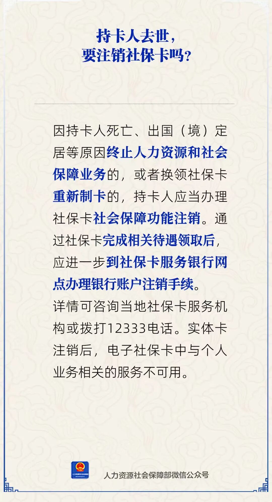 3.持卡人逝世要刊出社保卡吗?一图读懂:近来,“人力资源和社会保障部”微信大众号发文,针对“持卡人逝世,要刊出社保卡吗?”这一问题给出答案。(人力资源和社会保障部)
