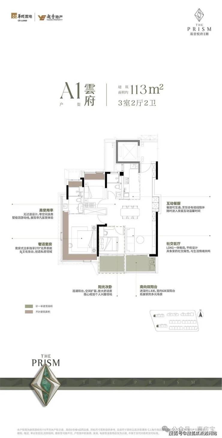 由于处于楼栋中间位置,没有了A1户型的转角飘窗,但延续了南向双阳台和互动餐厨等设计,空间利用一样充分。