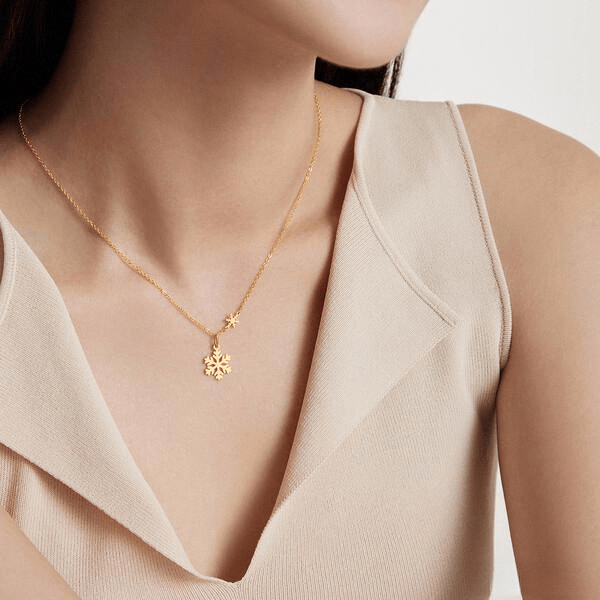 这款周大福的黄金项链以小雪花为设计主题,展现出一种轻盈的美感,十分合适女士和情侣佩戴。项链长度为40厘米,搭配的吊坠大小适中,吊坠高1.44厘米、宽1.05厘米,让整体造型显得十分精致。采用光沙工艺,这种细腻的质感无疑提升了浪漫气息。